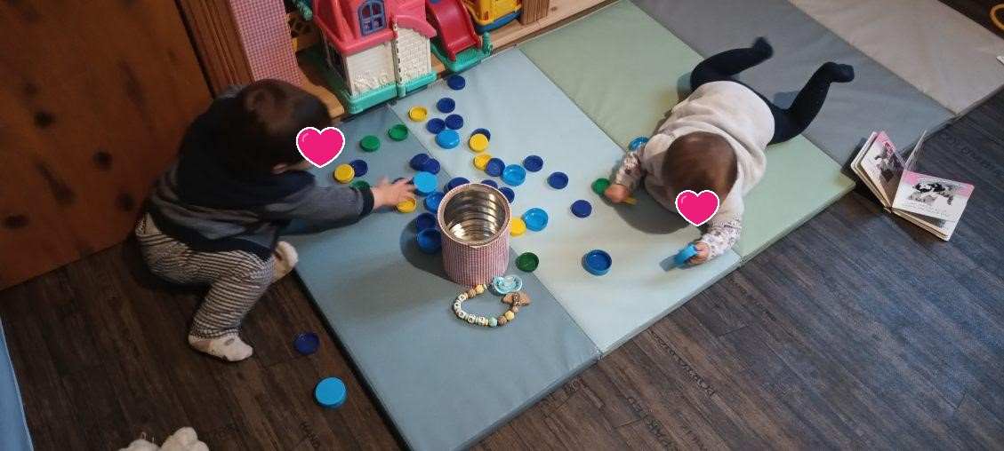 Le fameux jeu des bouchons remplit toutes ces fonctions. Lucas s’est amusé à renverser, à remettre dans la boite une fois, deux fois ,,, et ainsi de suite. Une boite de lait customisée et des bouchons, simple à créer.