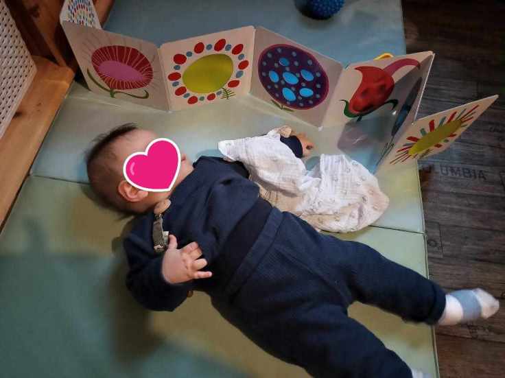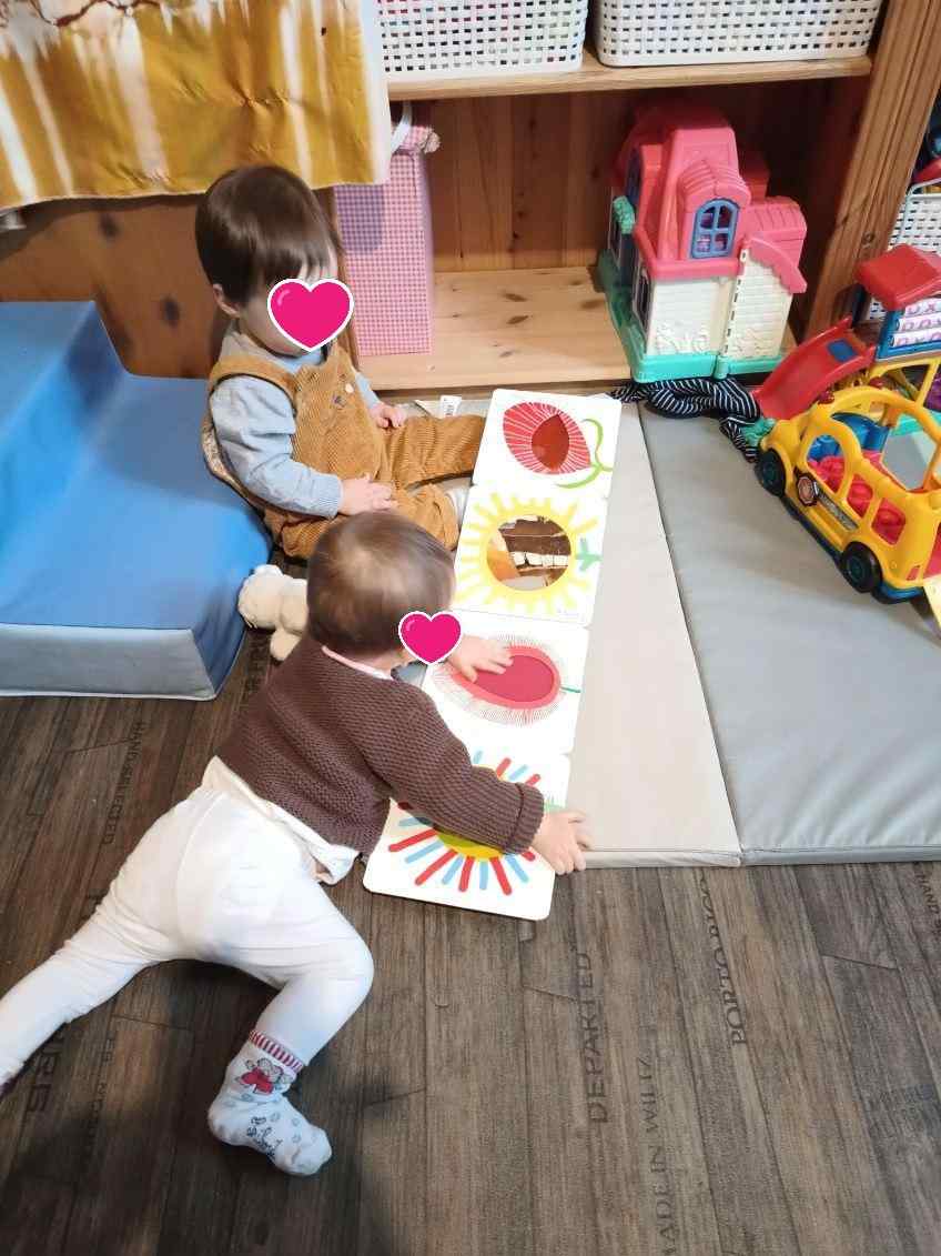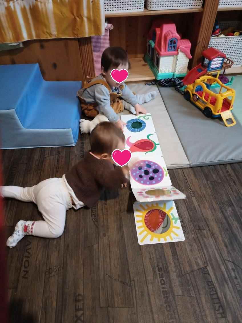 Hervé Tullet propose aux enfants un livre se dépliant tout en longueur, avec de très jolies pages. Chacun s’est amusé avec. Mael a pu observer les images tout en étant allongé. Puis j’ai mis le livre à plat. Alma et Lucas ont partagé un moment à regarder.