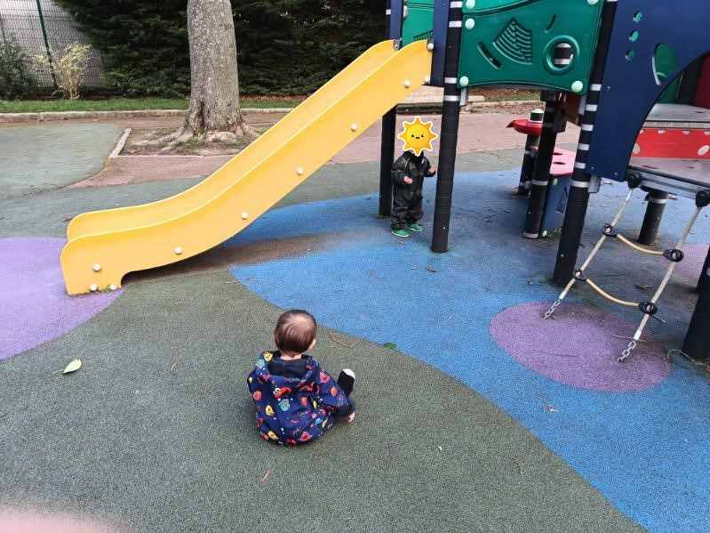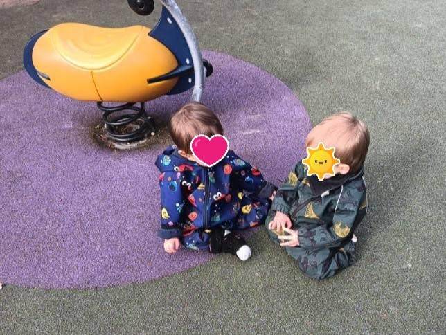 Georges (un copain 3 mois plus vieux) a été surpris de la voir hors de la poussette. il a été la regarder de plus près et papoter.