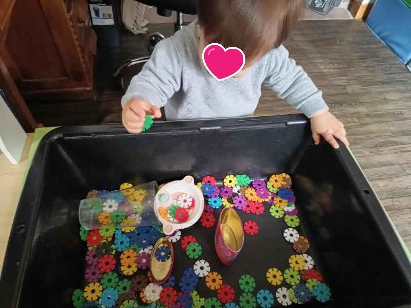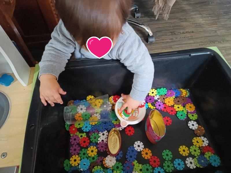 Lucas et Alma étaient bien concentrés pour prendre les petits flocons. Une belle histoire de contenus et de contenants… beaucoup de manipulations même parfois simplement remuer les pièces pour s’amuser c’est aussi de la motricité fine !!