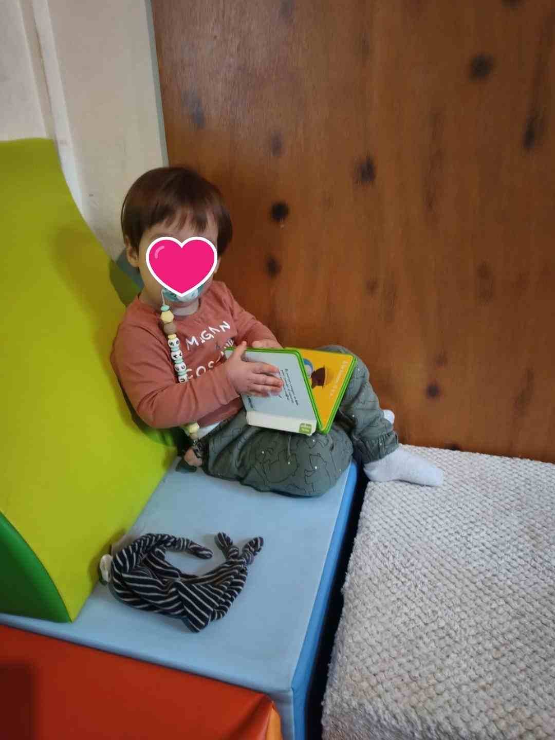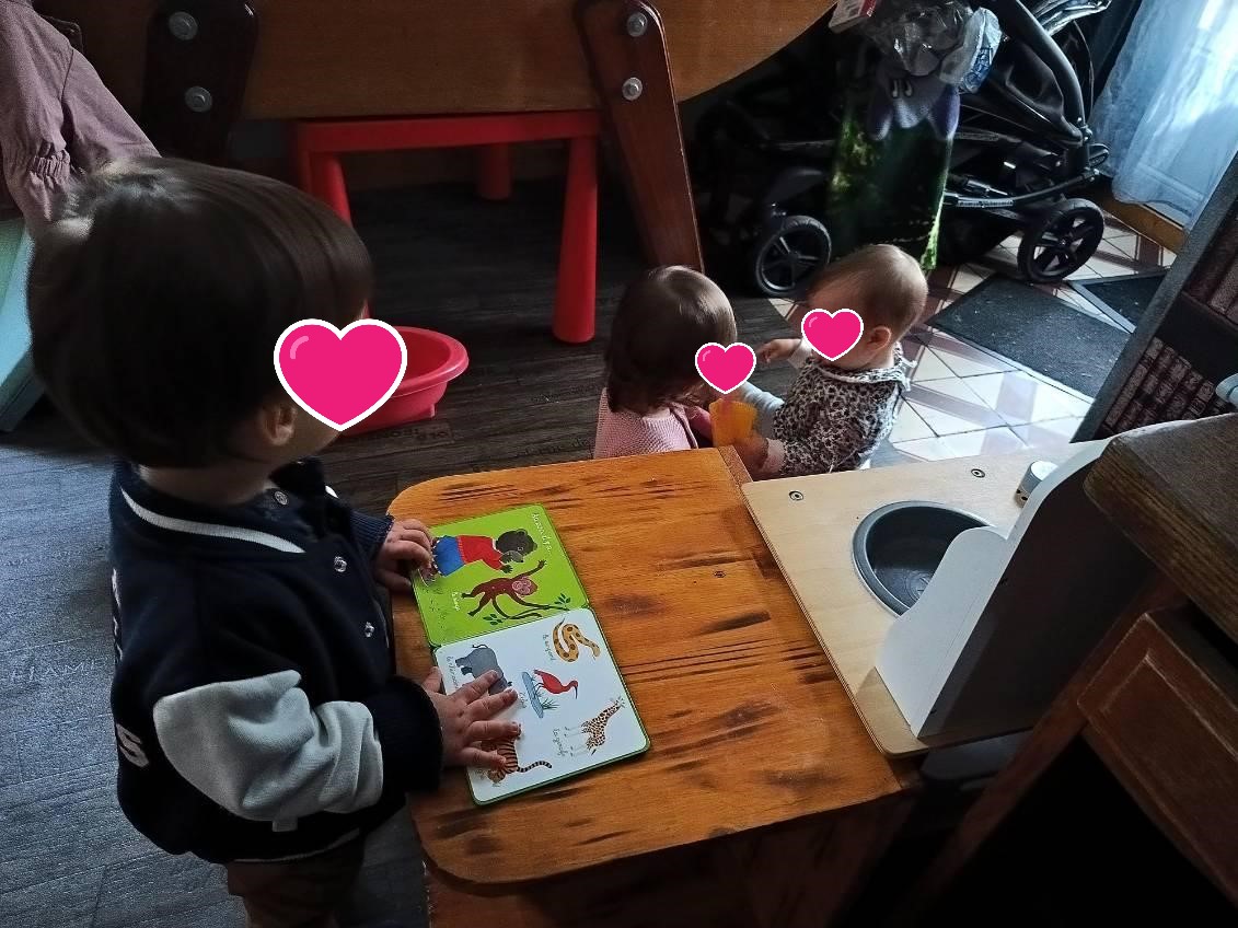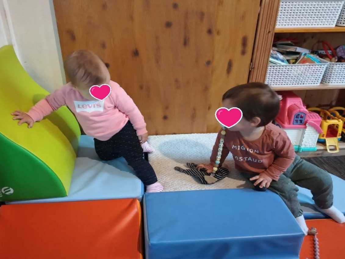 Le coin module est excellent pour la motricité. Il s’agit de l’endroit préféré des plus grands en général, ils sont en hauteur. Lucas s’y installe dès qu’il arrive pour feuilleter son livre du jour. Mais très vite il est rejoint par les demoiselles. Heureusement il y a de la place pour tout le monde.