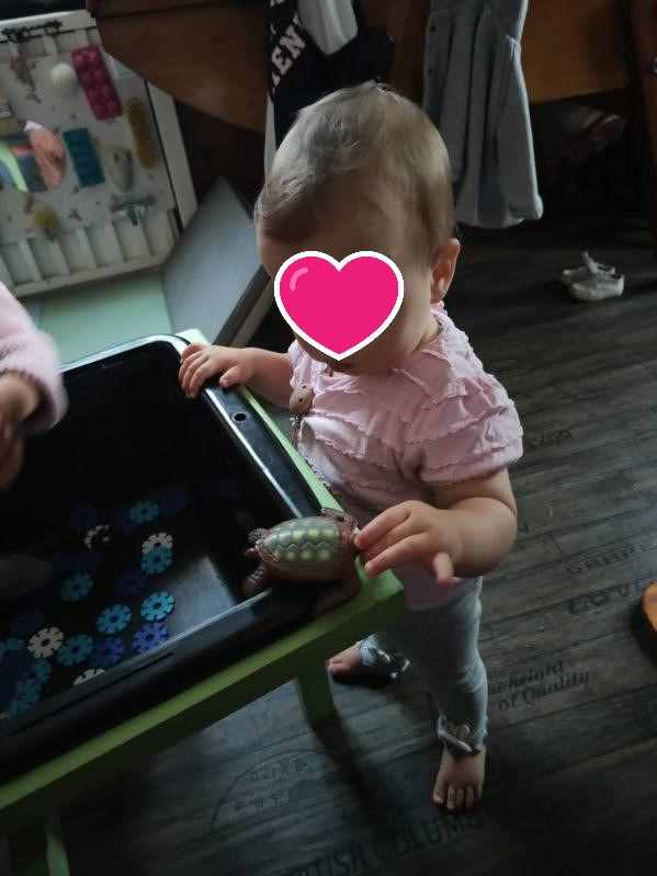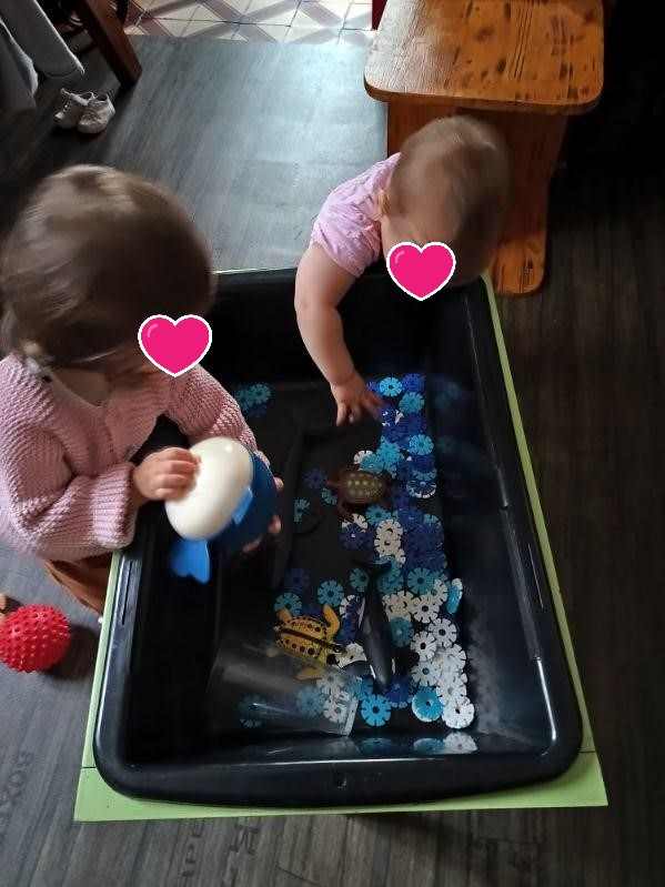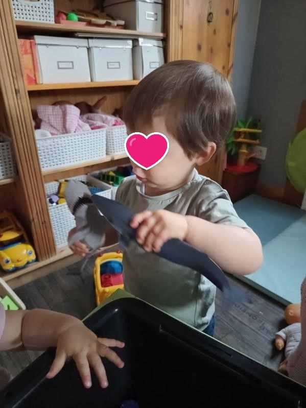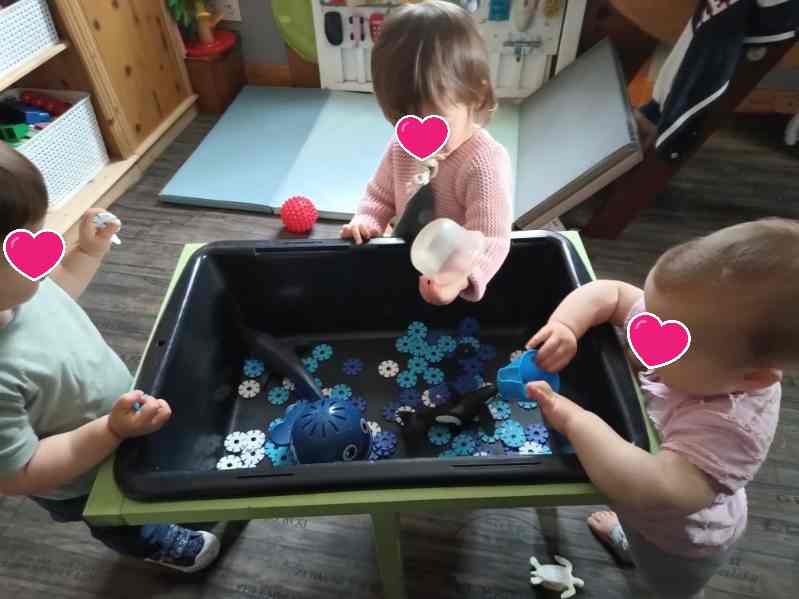 Cette fin de semaine, les enfants découvrent un bac sensoriel avec des animaux et des décors en bleu et blanc. Lucas a été intrigué par les dents du requin , Alma a préféré la baleine et Elisa les tortues.