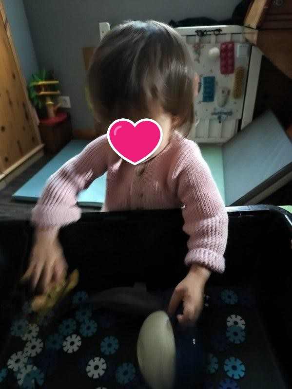 Chacun à sa manière a pu toucher, explorer ce bac. Quelques tasses de la dinette ont permis des transvasements. Elisa a tenté d’imiter les grands et cela lui a plu. Un très bon moment.