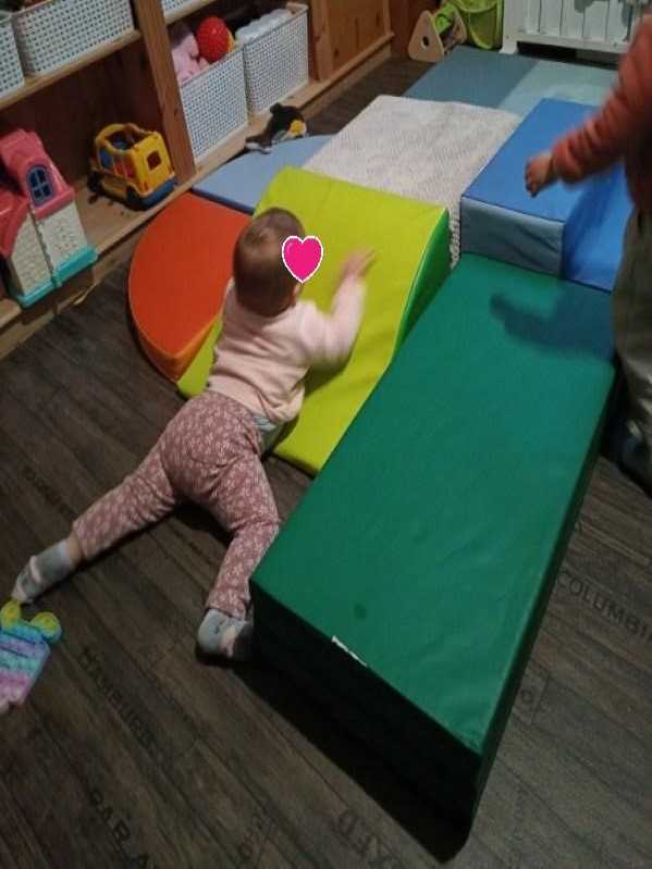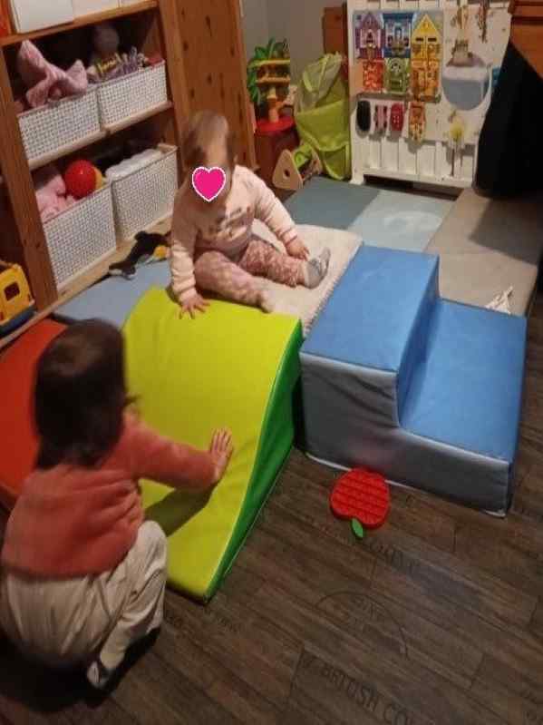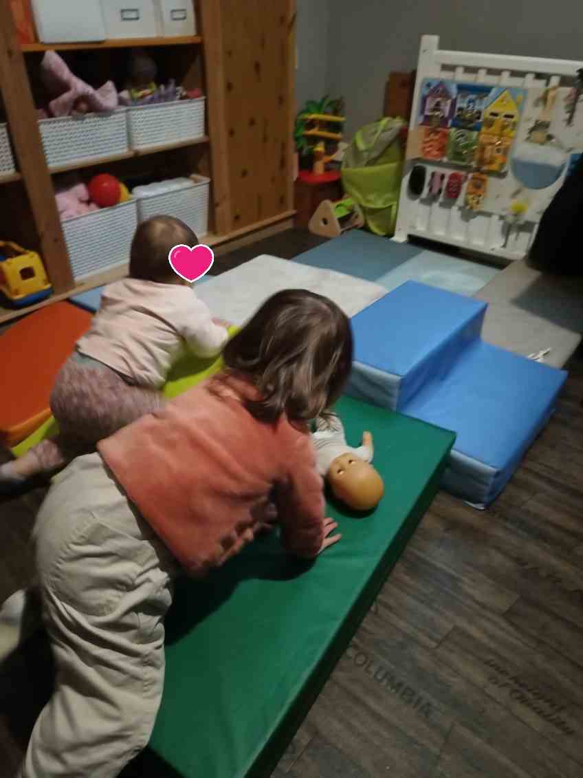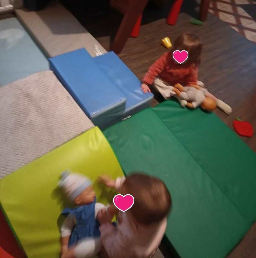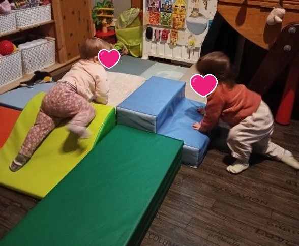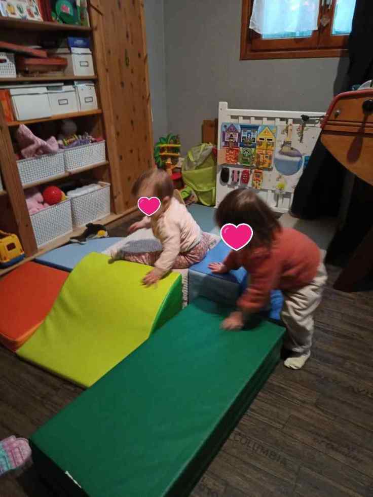 ce matin surprise il s’est mis à neiger donc pas très motivée pour sortir. Alors changement de programme, je déplace les modules . et voilà un parcours motricité pour les demoiselles. Lucas est absent pour quelques jours.