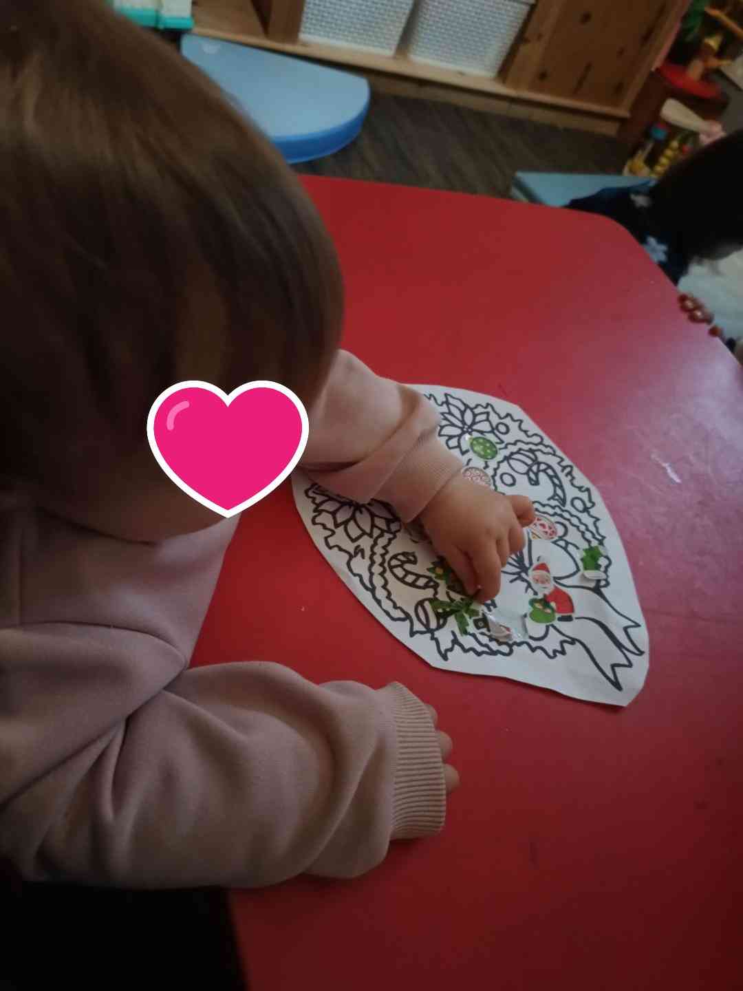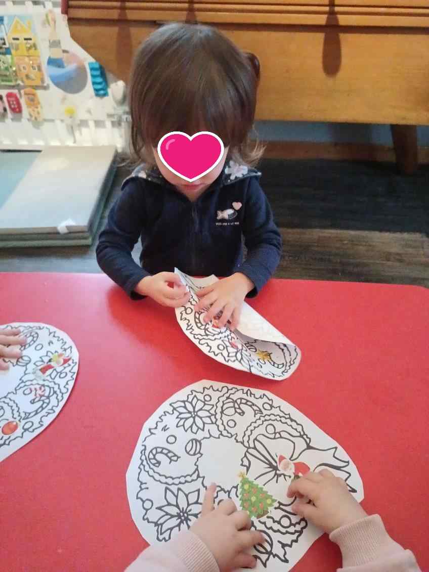 J’aime assez l’idée de rythmer le quotidien des enfants avec des décors pour leur cahier de vie. Cette année ce sont les couronnes, nous avons pu décorer celle d’automne. Maintenant nous commençons les activités sur le thème de Noël. Pas toujours facile de coller ces gommettes mais on le fait tous ensemble et c’est amusant.