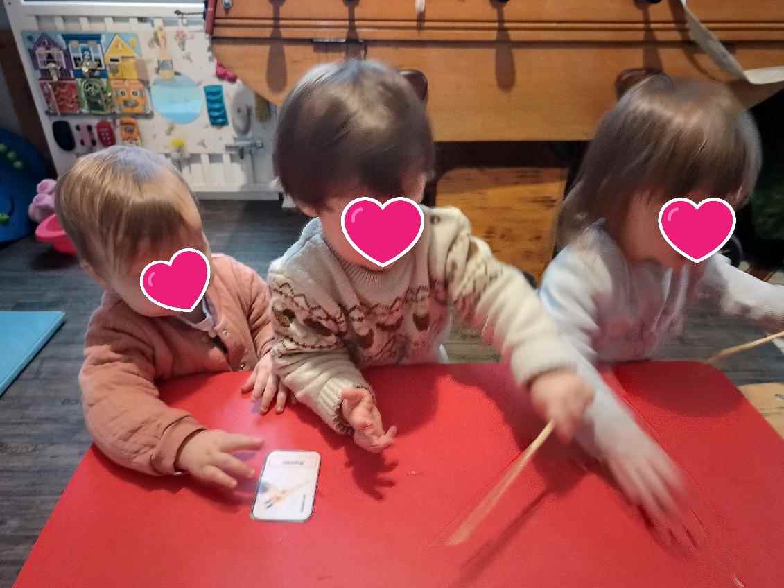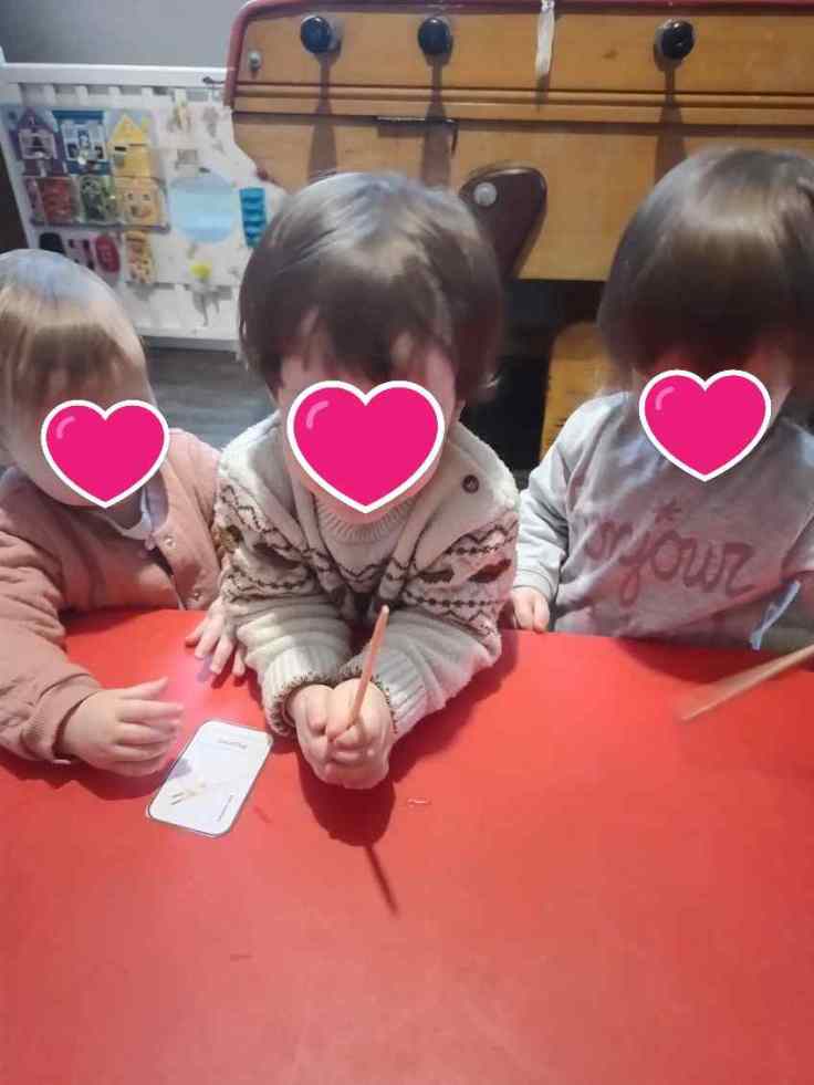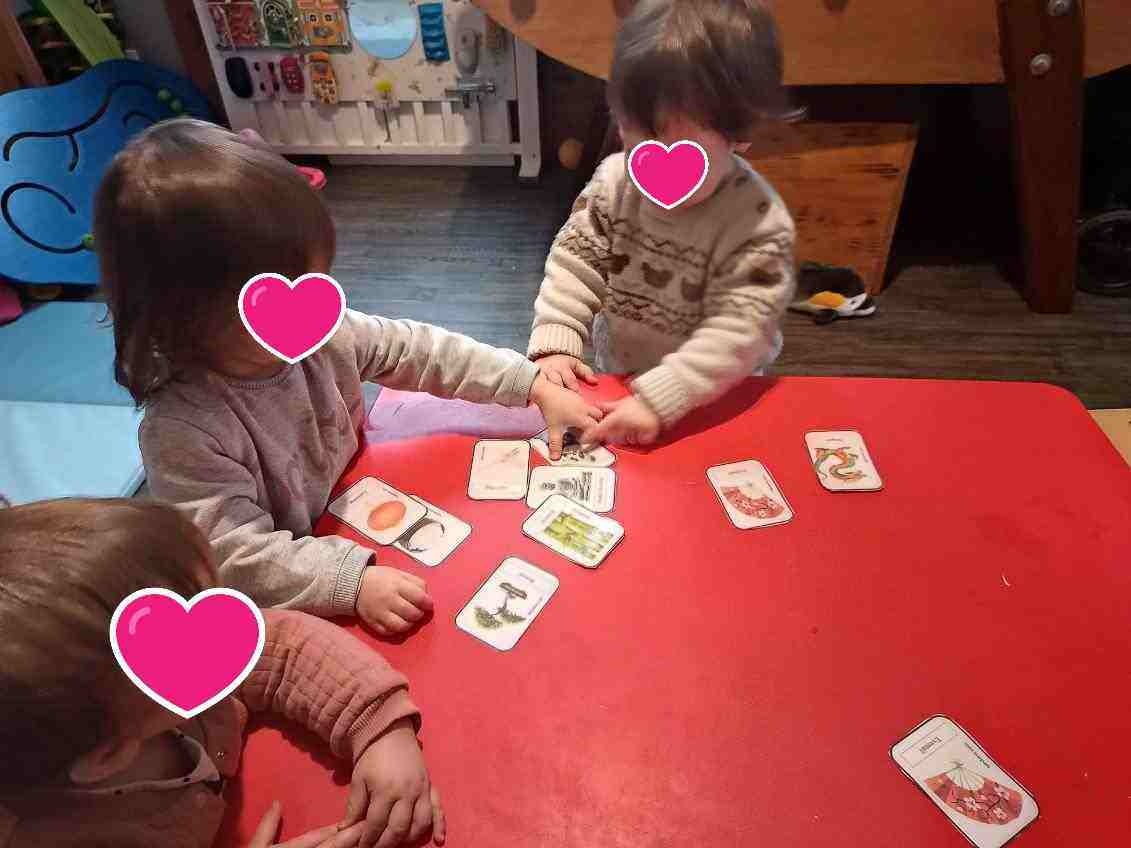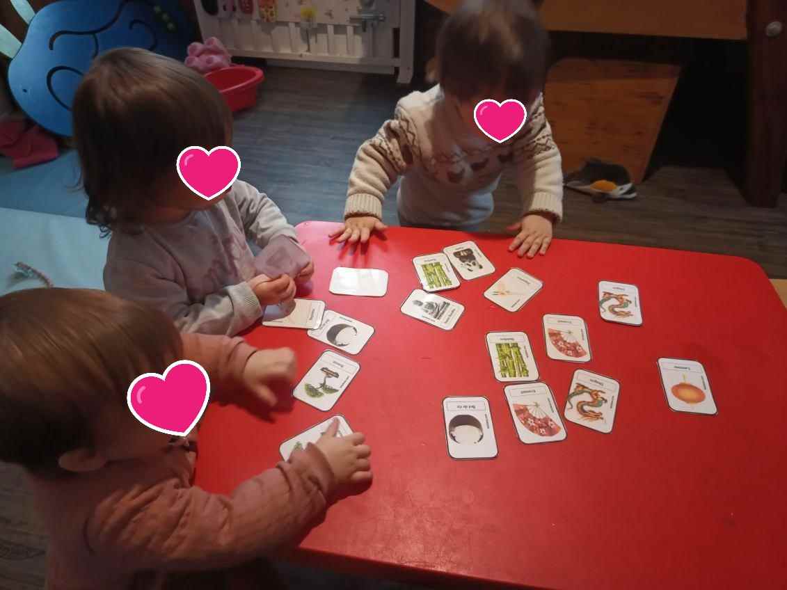 Ensuite nous nous sommes amusés à retrouver les paires . En imprimant 2 fois les images de nomenclature cela vous un jeu de mémory. Elisa s’est amusé à attraper les cartes et les redonner à Lucas et Alma, elle répétait les mots à sa manière .