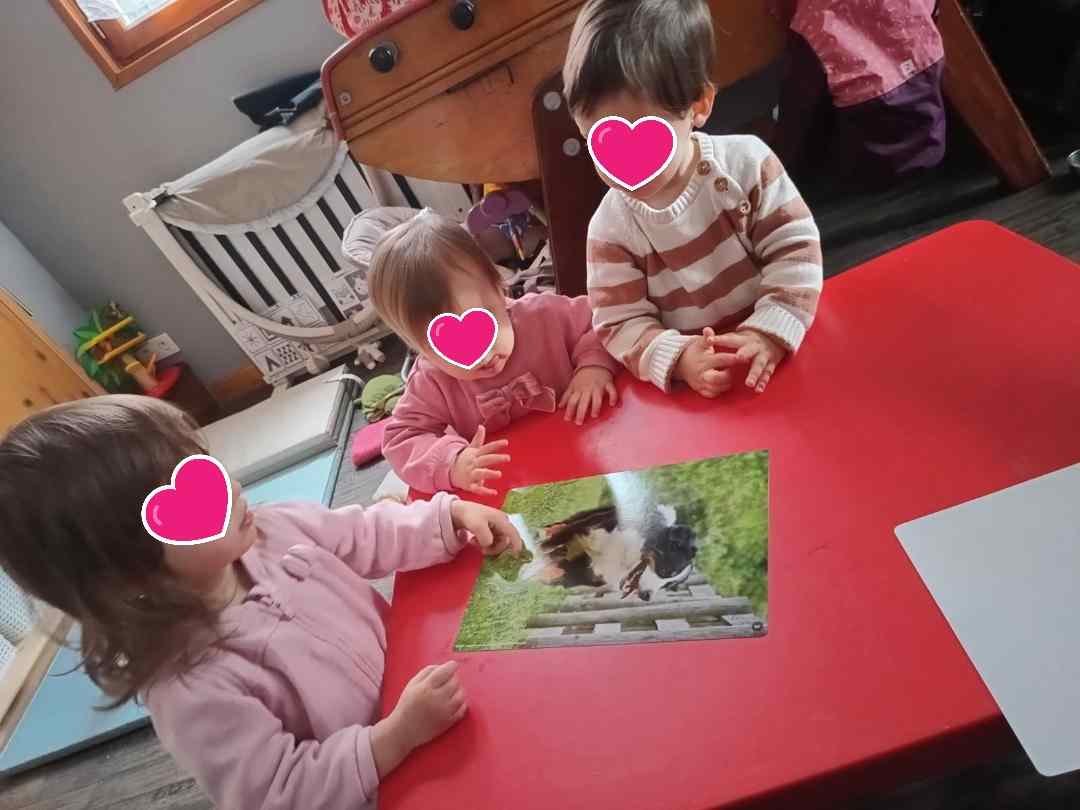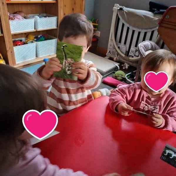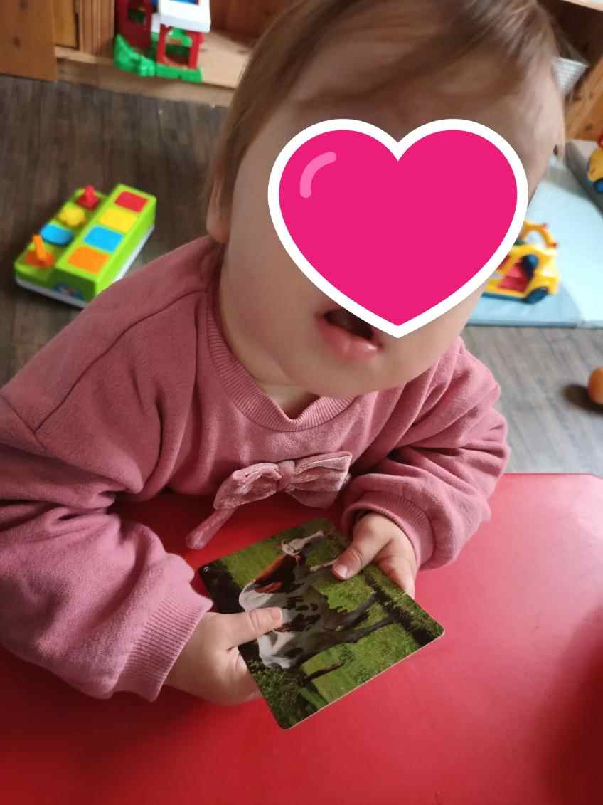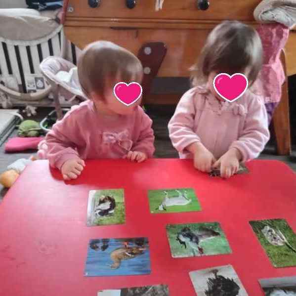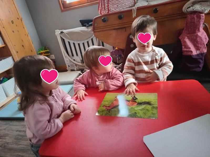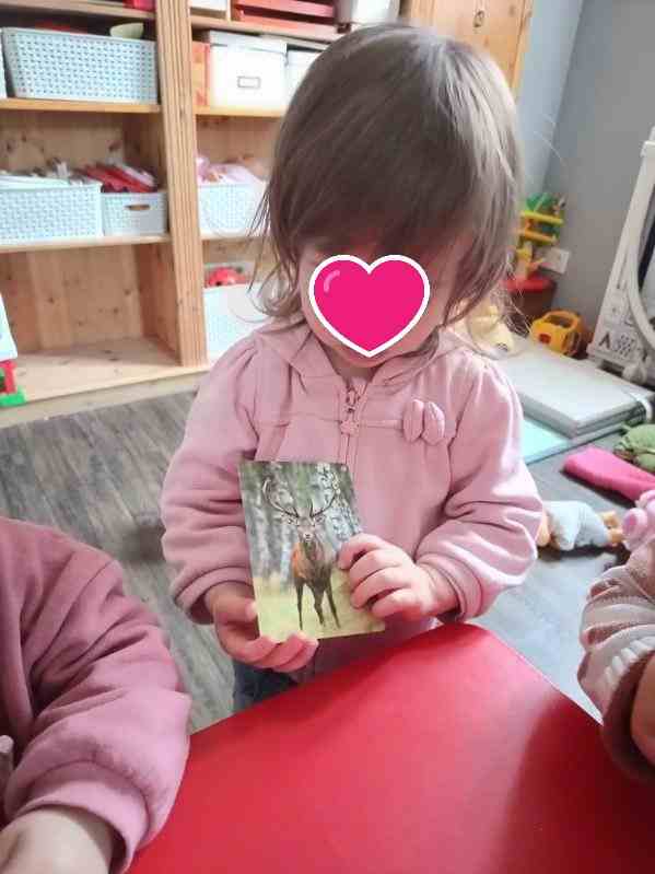 Puis dans un second temps, je dispose les images plus petites sur la table. Je propose aux enfants de découvrir l’animal à qui correspond le cri. ( 😱 un peu effrayés par le loup et l’ours mais dans l’ensemble ça a bien plu😀.)