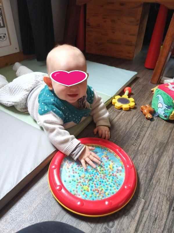 La magie opère… Par curiosité Arthur s’est déplacé pour venir toucher. C’est rigolo ça fait du bruit quand on tape avec les mains dessus.
