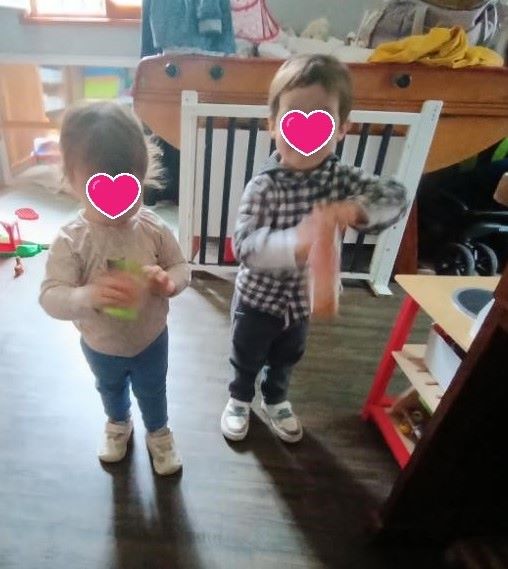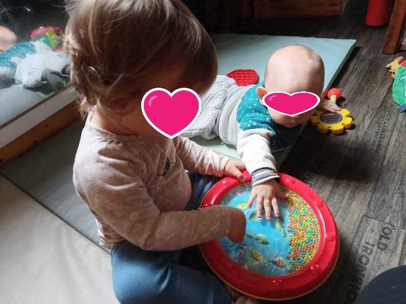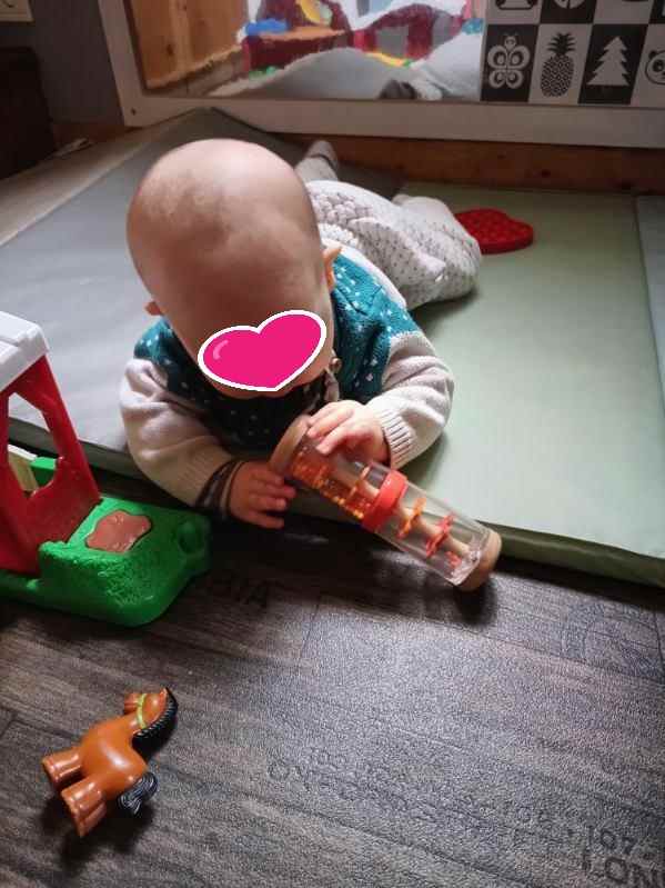 Arthur posé sur mes genoux était très attentif. Nous avons d’abord fait doucement pour écouter les différents sons puis Elisa et Lucas ont secoué pour encore plus de bruits !!