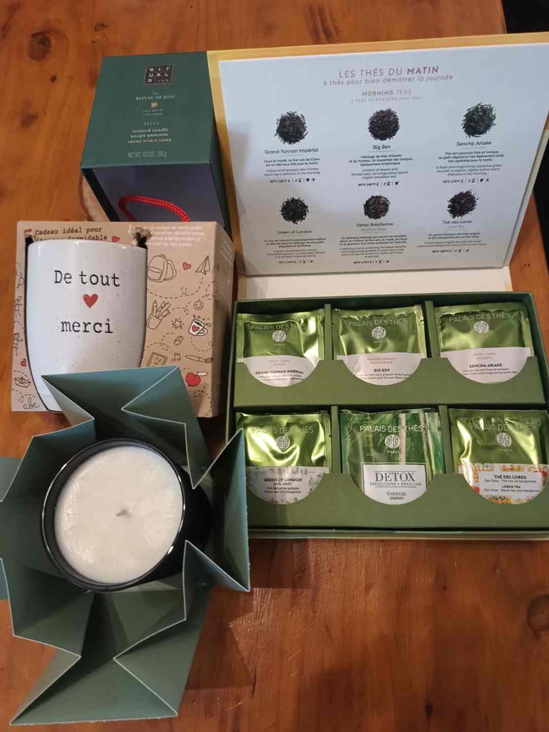 De biens belles surprises .. une très jolie tasse , des sachets de thé (de mon fournisseur préféré) et une magnifique bougie (avec une odeur magique) voilà de quoi m’accorder un délicieux moment