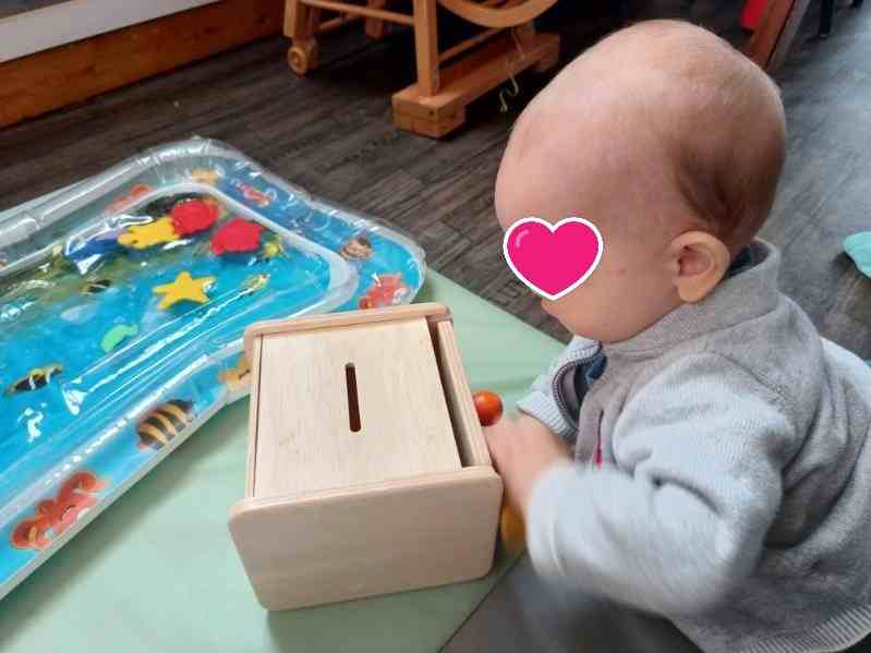 « boite de notion de permanence , elle a pour but de développer sa coordination oeil main, et lui font comprendre l’existence de l’objet même s’il est caché » »