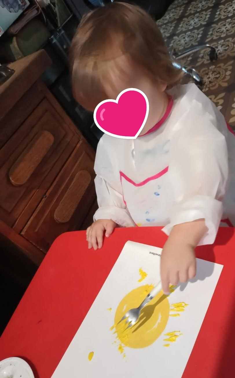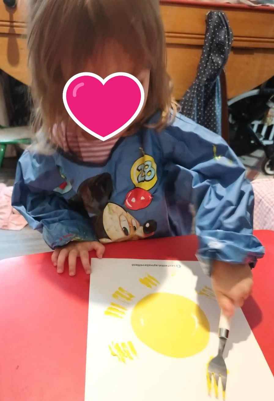 Un peu de peinture jaune et surtout des fourchettes pour imiter les beaux rayons !! (merci à Angélique assistante maternelle pour ses idées lien ici)