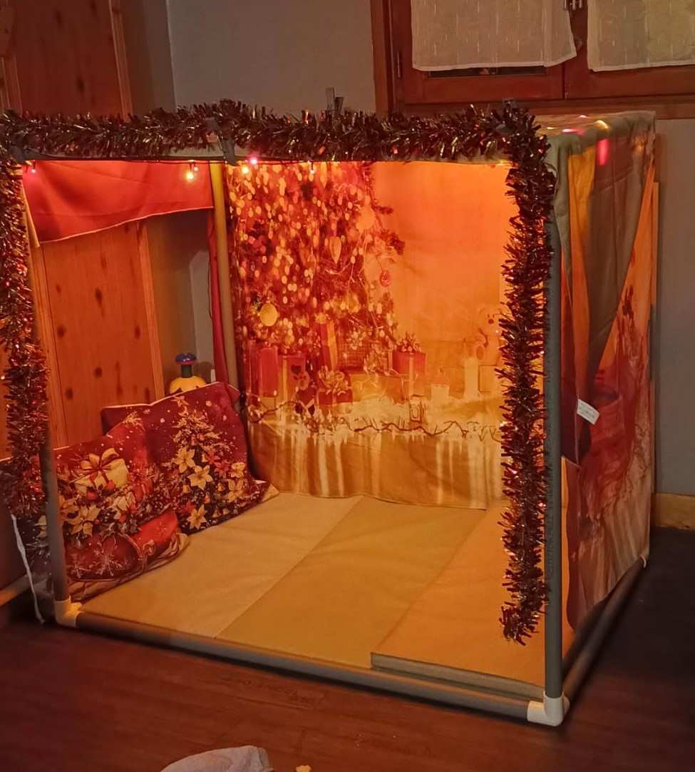 Il s’agit d’un immense rectangle constitué de tuyaux pvc et d’angles. Il sera aménagé selon les thèmes et mes envies. Il faut savoir inventer pour varier le quotidien. Les réactions des enfants et des parents m’ont fait bien plaisir. (article à venir)