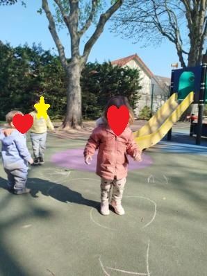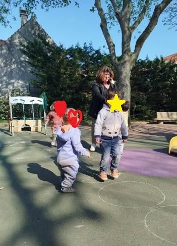 Comment? en traçant des ronds, des traits et des flèches pour inciter les enfants à sauter, courir et tourner le long d’un chemin. Arthur suit les plus grands. Elisa est tout à son aise quand il s’agit de sauter !!😊