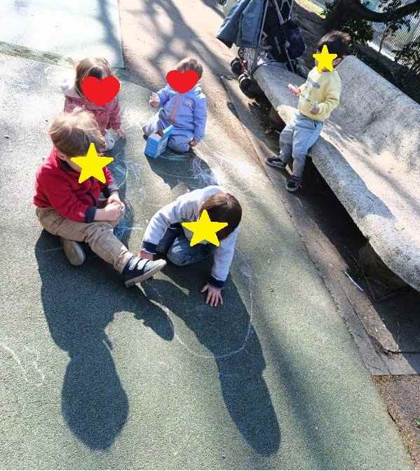 Et oui tout simplement .. une boite de craies et un peu d’imagination… Dans un premier temps, laisser les enfants tracer et enjoliver le sol du parc….