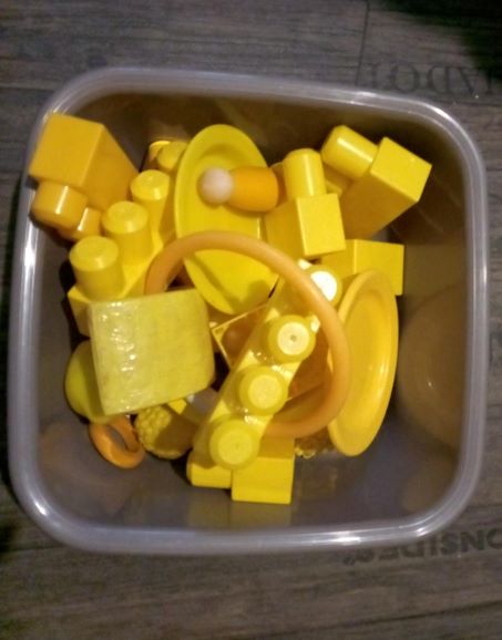 Nous commençons par le jaune ..... D'abord une "box" remplie d'objets divers et variés .. présentation des pages des livres (merci Pop et Choubidouwha) voici aussi le détail de la boite...(légos, dinette, petits personnages...) ET bien sur du coloriage