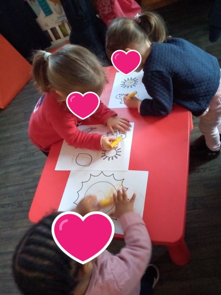 Nous poursuivons nos activités sur les couleurs.. Entre coloriage , gommettes et collage, il y a de quoi faire pour aborder les couleurs Romane a préféré tamponner la peinture, Romy utiliser un pinceau et Elisabeth ce sont plus les collages qui lui davantage plus Mais toutes les 3 adorent "travailler" avec tatie...