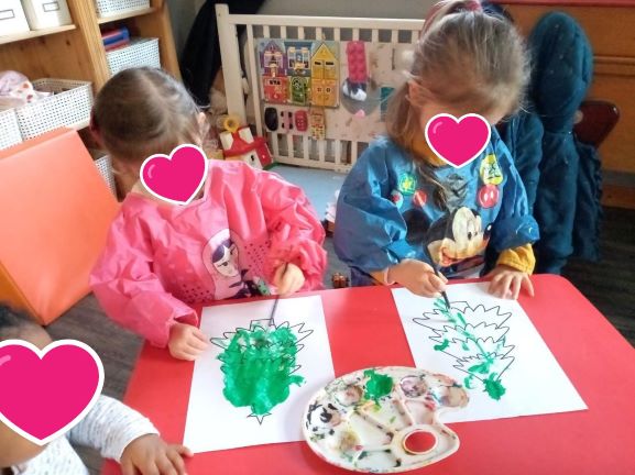 Nous continuons notre travail sur les couleurs. cette fois ci c'est avec la peinture... Elisabeth et Romy apprécient beaucoup de se servir des pinceaux (ce sont les grandes...) Romane préfère tamponner.. Les gestes se font de plus en plus précis avec l'âge .