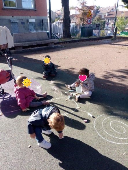 Sortie au parc pour rejoindre les copains. Ce matin c'était activité craies les enfants ont apprécié !!