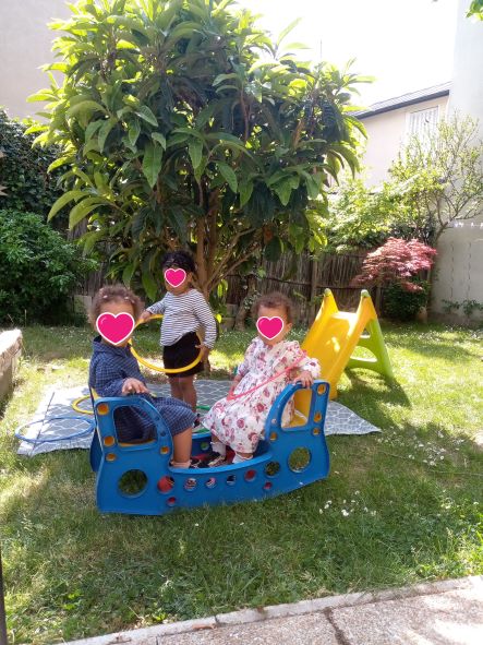 Séance motricité libre !! Tatie a installé dans le jardin toboggan, mini balancelle à 2 et les cerceaux.. Chacune a exploré à sa manière les jeux Mais celui qui a eu le plus de succès c'est :