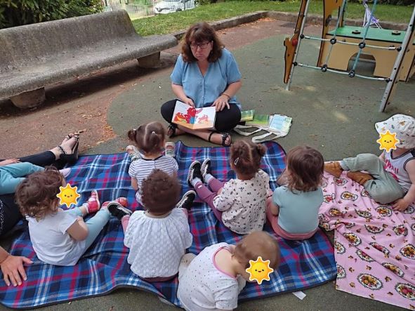 Nous avons profité de la fraicheur ombragée du parc pour que les enfants puissent jouer. L'installation de la couverture signifie un moment de calme. Tous se sont assis . Que la lecture commence... entre l'histoire de doudou, de Nina et sa tétine, et celle du loup il y a eu des sacrés frissons surtout quand... Lire la Suite →