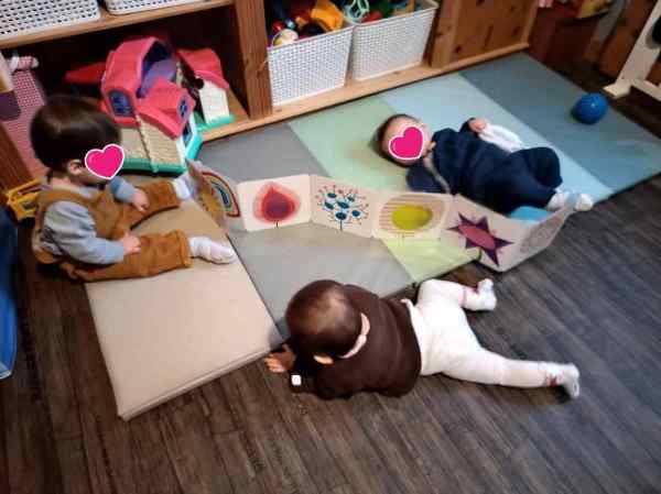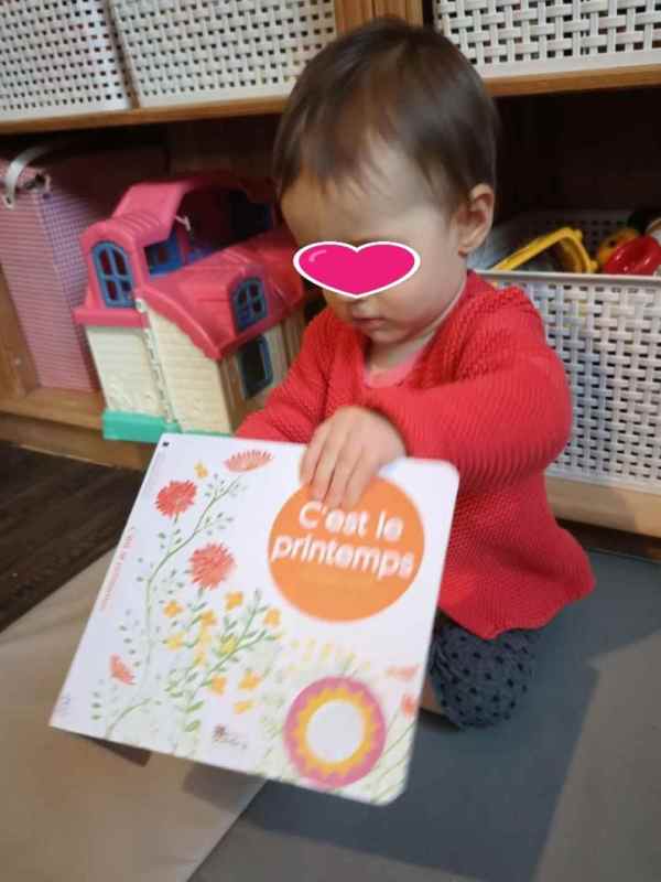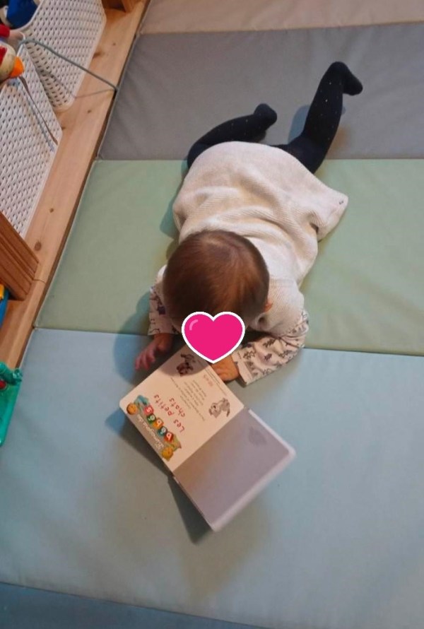 Alma se déplace. Elle repère les livres que je pose sur le tapis. Elle s'en approche Elle l'attrape, le prend et l'ouvre pour regarder.. et même si elle bouge le livre suit...