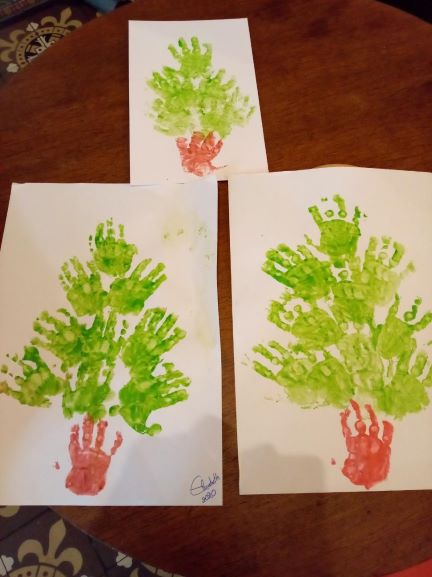 Atelier Peinture ce matin . Chacune son tour, même Romane a pu participer ... c'était amusant de peindre avec les mains ..et en plus ça chatouille les doigts Ensuite les grandes ont utilisé la perforatrice pour créer des boules de Noël. ET VOICI LE RESULTAT :