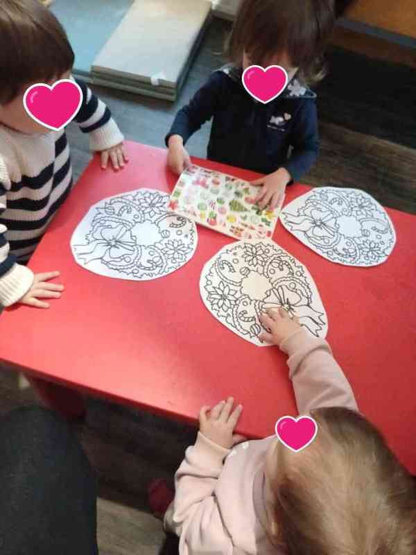 J'aime assez l'idée de rythmer le quotidien des enfants avec des décors pour leur cahier de vie. Cette année ce sont les couronnes, nous avons pu décorer celle d'automne. Maintenant nous commençons les activités sur le thÚme de Noël. Pas toujours facile de coller ces gommettes mais on le fait tous ensemble et c'est amusant.