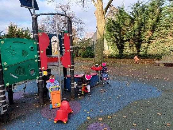 Tant qu'il ne pleut pas , nous sortons retrouver les copains au parc. Tous sont très contents d'être ensemble. Il y a de quoi s'amuser entre les porteurs, les poussettes, le toboggan...Ce matin Elisa a été très applaudie: elle s'entraine à marcher seule.
