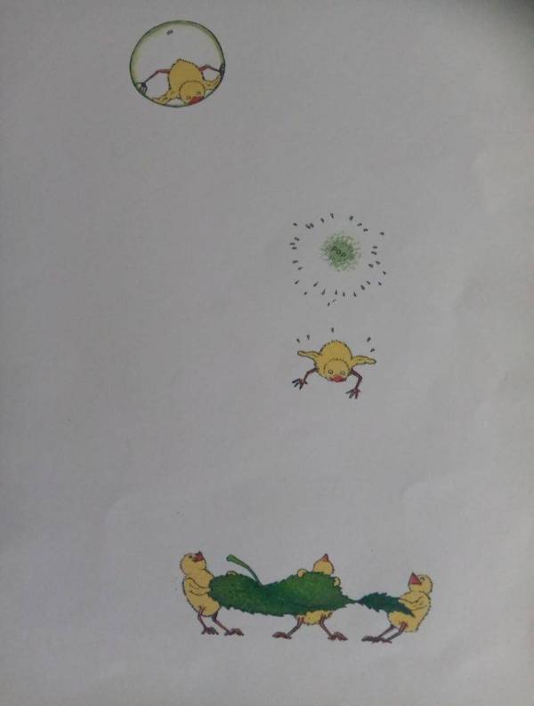 ça commence par des poussins dans des bulles de savon . Thaissa et moi avons ouvert le livre : des rangées d'objets et de personnages bien alignés.. Nous tournons les pages et là c'est le bazar..les poissons volent dans le ciel, le rat rentre dans le gant... Un curieux livre qui fait parler ... j'ai... Lire la Suite →