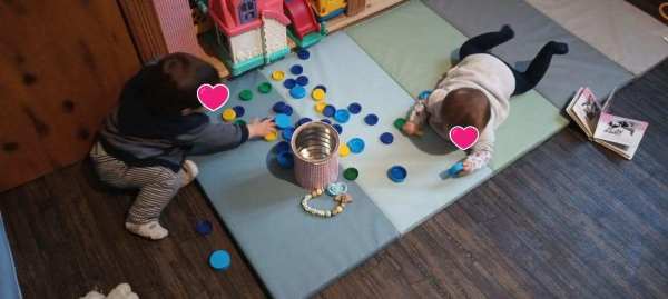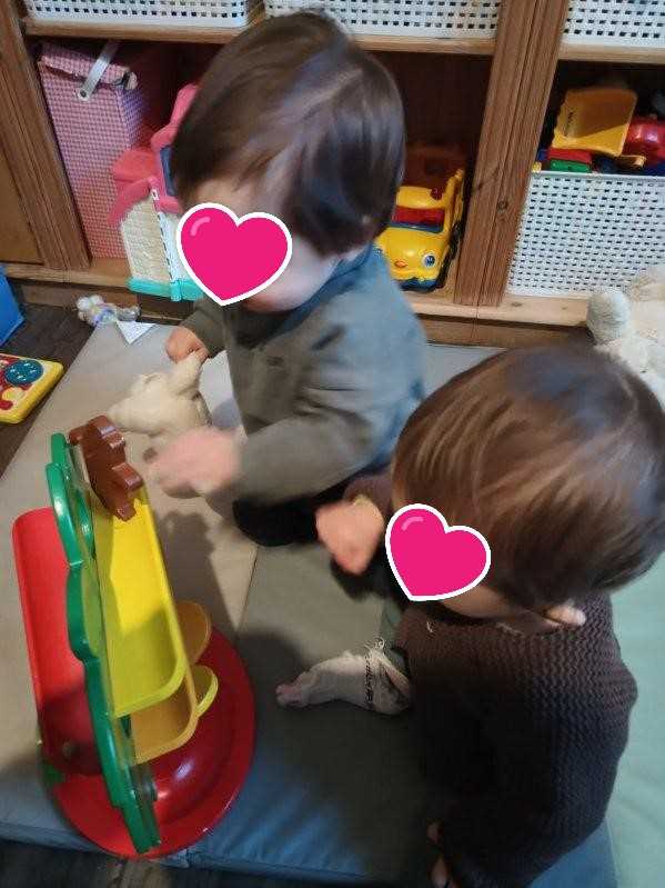 Alma s'amusait à faire des tours quand Arthur a trouvé cela intriguant. Alors il a commencé à prendre un légo puis un deuxième. Quelques essais plus tard, il a compris le principe .. et c'est parti pour une séance de motricité fine.. une belle coordination main œil 😊